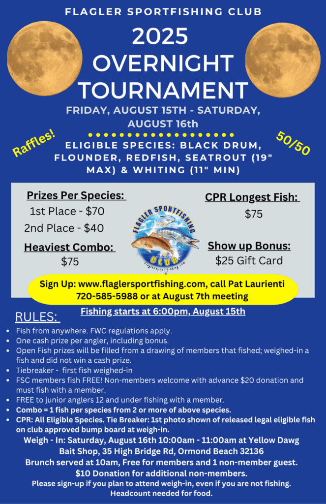 Non-Members/Guests are welcome with a donation of $20.00 each and must fish with a member.. Click on the link to pay for guest. https://flaglersportfishing.com/product/tournament-guest/