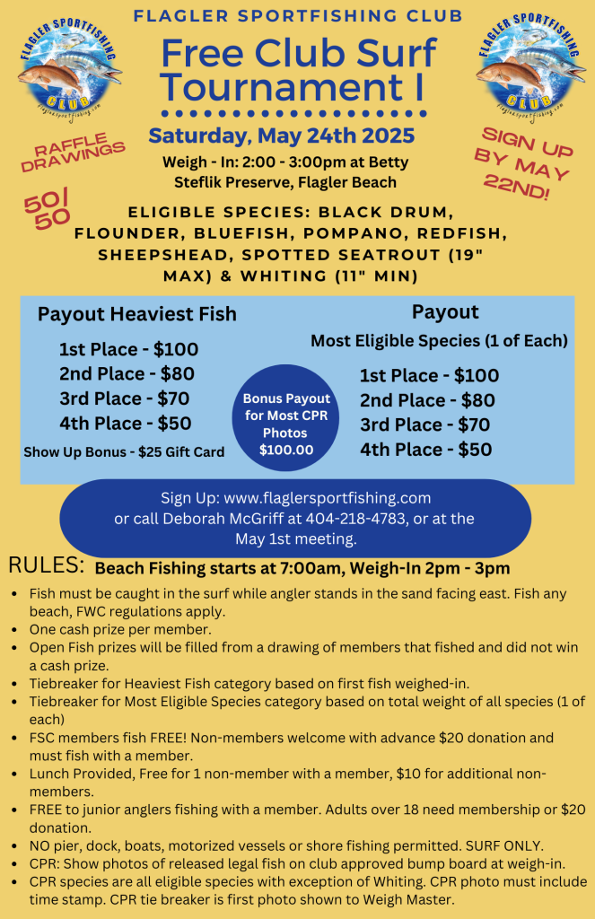 Non-Members/Guests are welcome with a donation of $20.00 each and must fish with a member.. Click on the link to pay for guest. https://flaglersportfishing.com/product/tournament-guest/