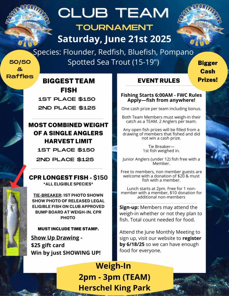 Non-Members/Guests are welcome with a donation of $20.00 each and must fish with a member.. Click on the link to pay for guest. https://flaglersportfishing.com/product/tournament-guest/