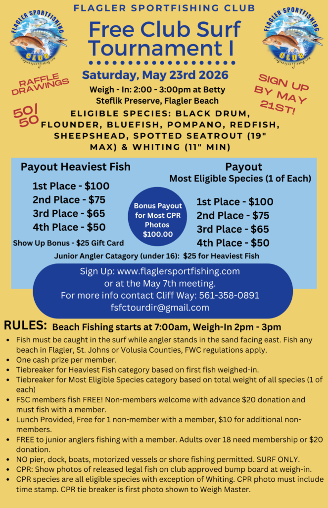 Non-Members/Guests are welcome with a donation of $20.00 each and must fish with a member.. Click on the link to pay for guest. https://flaglersportfishing.com/product/tournament-guest/